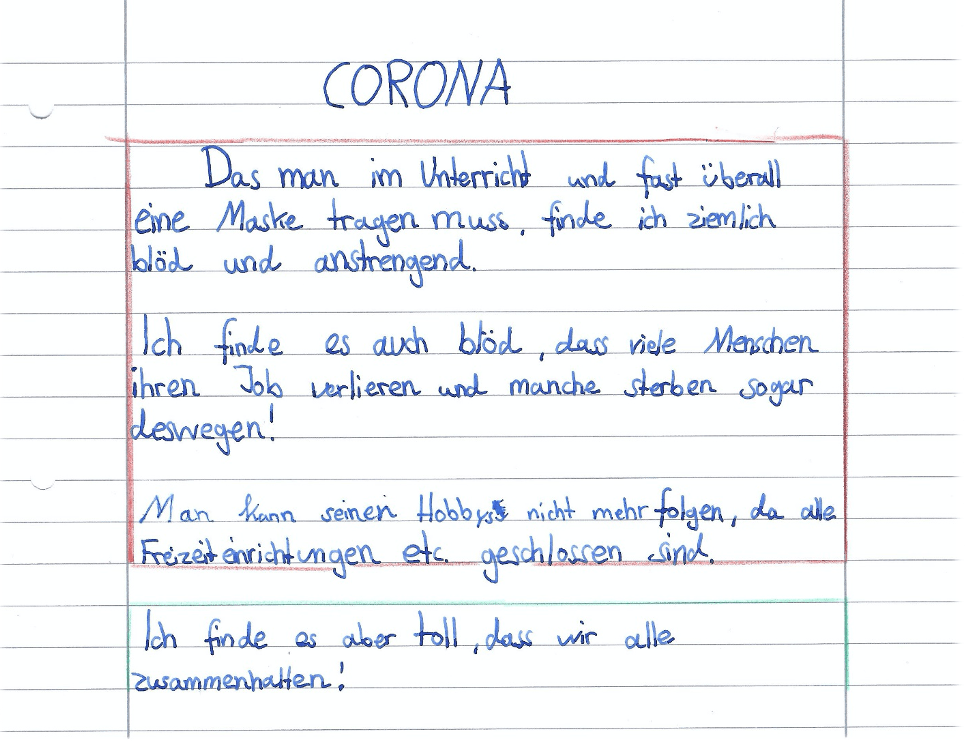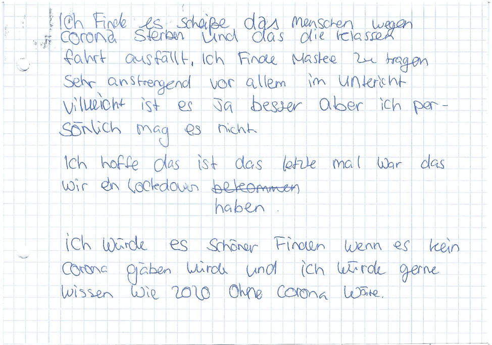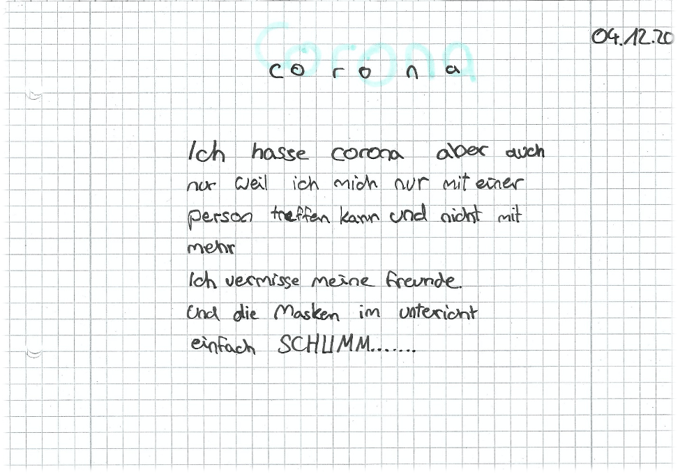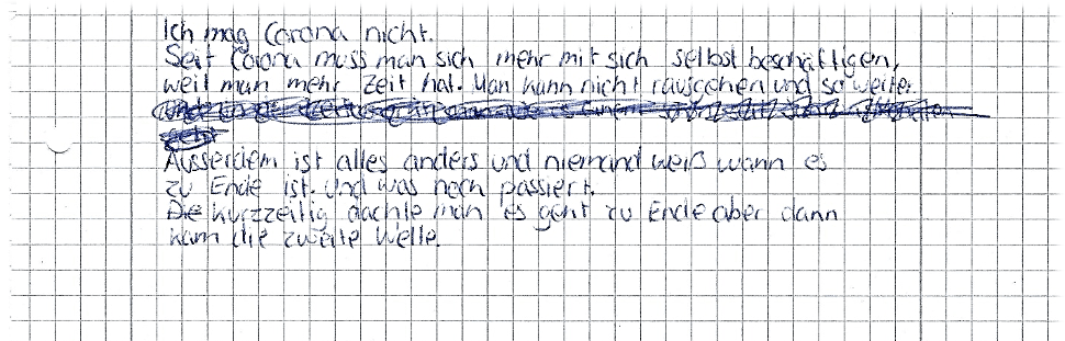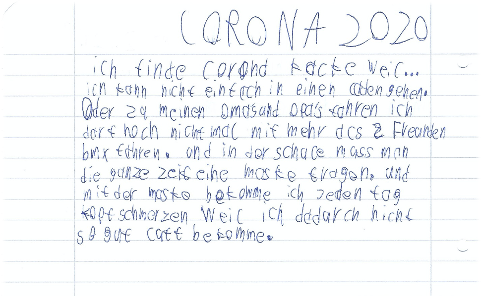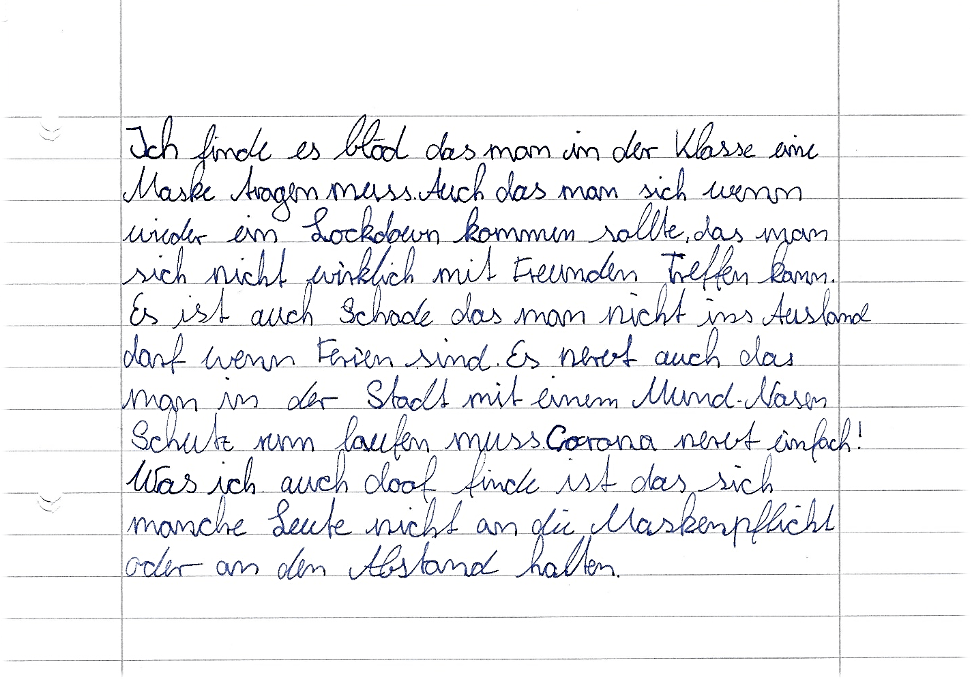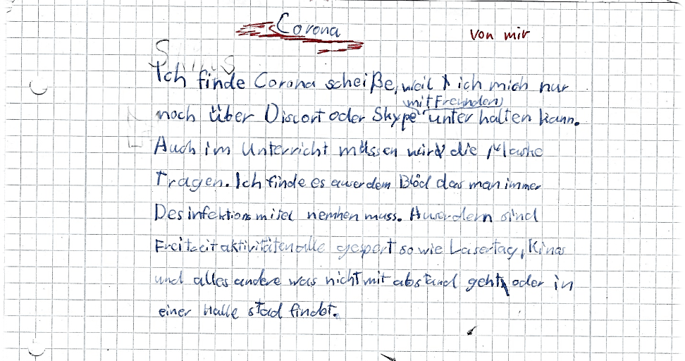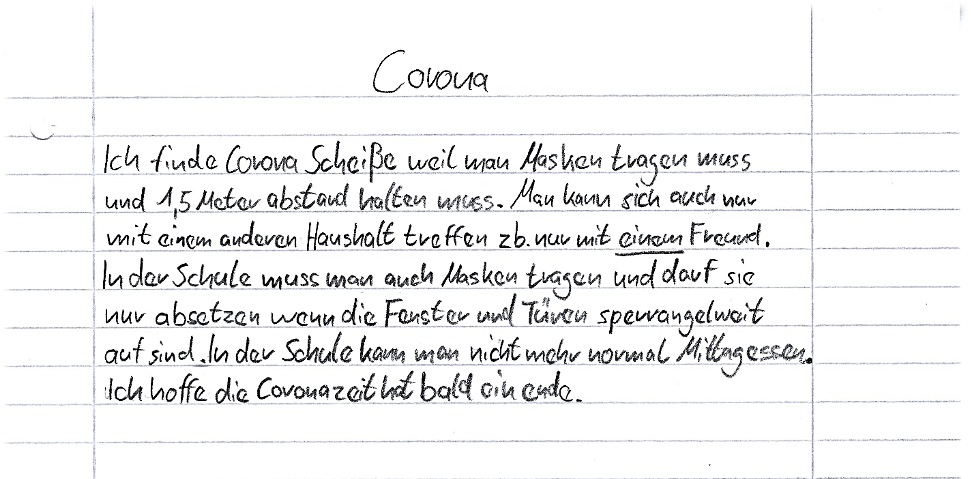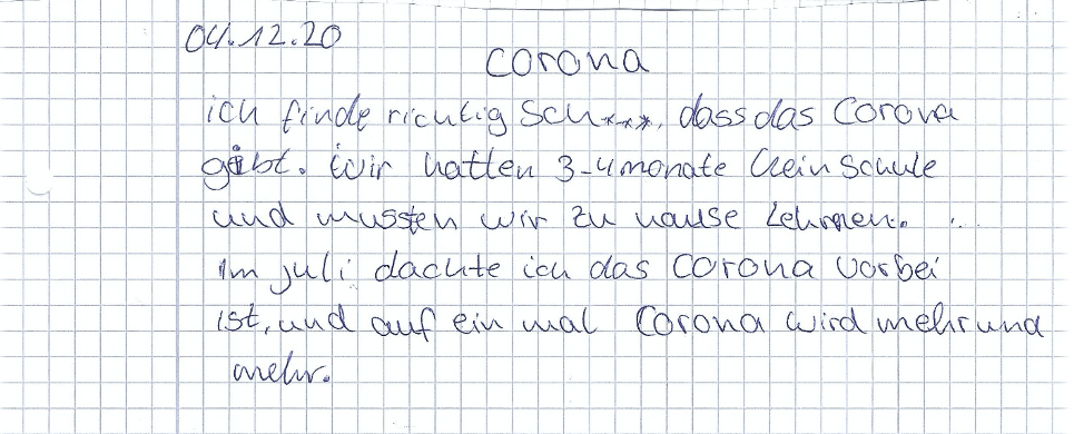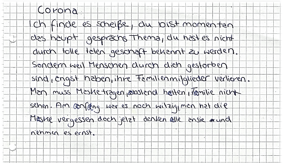 "Für mich bedeutet Corona vor allem Langeweile, keine Schule, keine Freunde, kein Sport und überalll nur ein Thema: Corona."