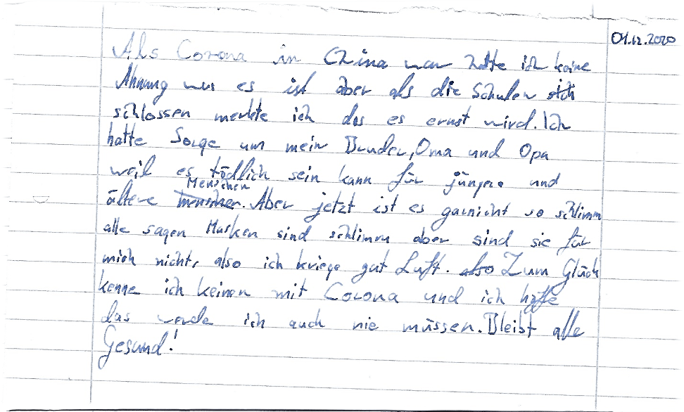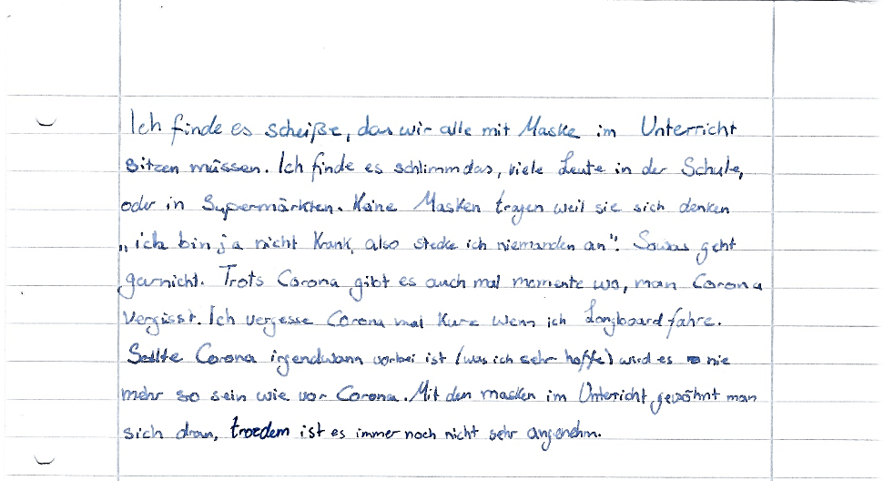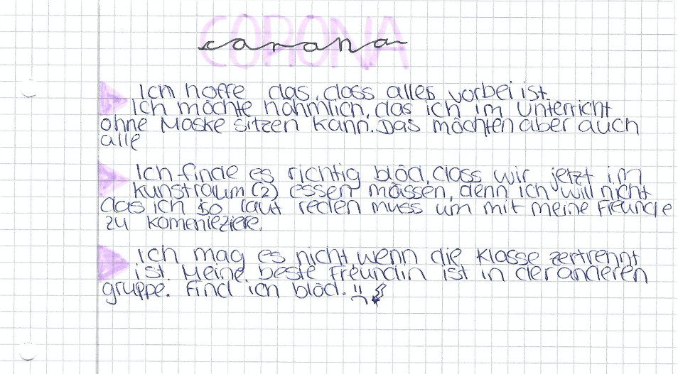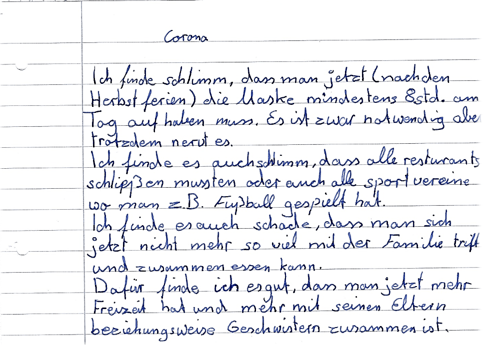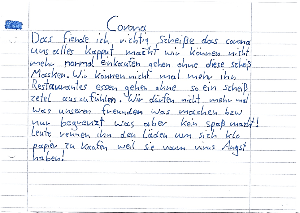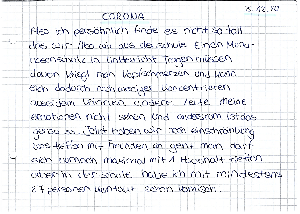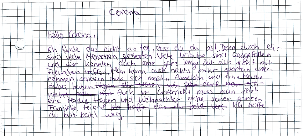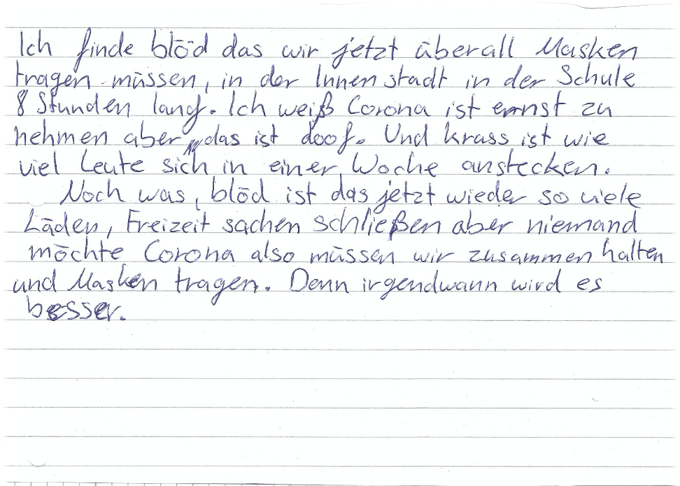 "Für mich bedeutet Corona vor allem Langeweile, keine Schule, keine Freunde, kein Sport und überalll nur ein Thema: Corona."