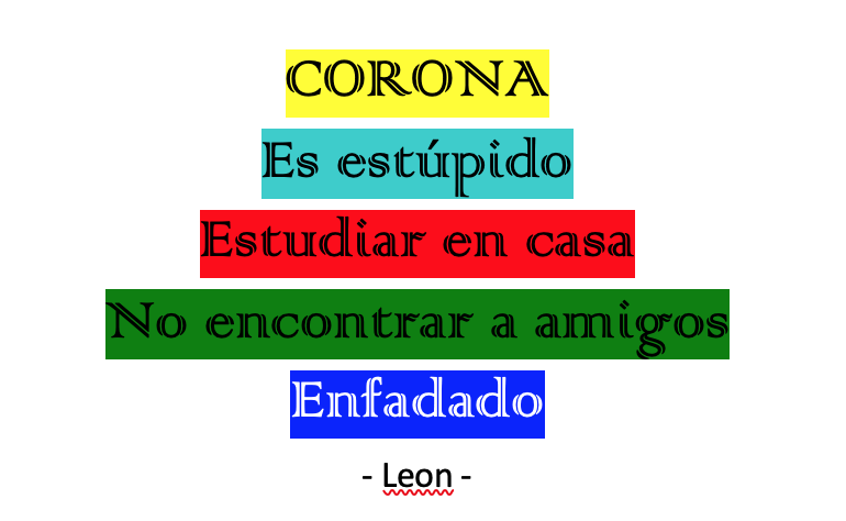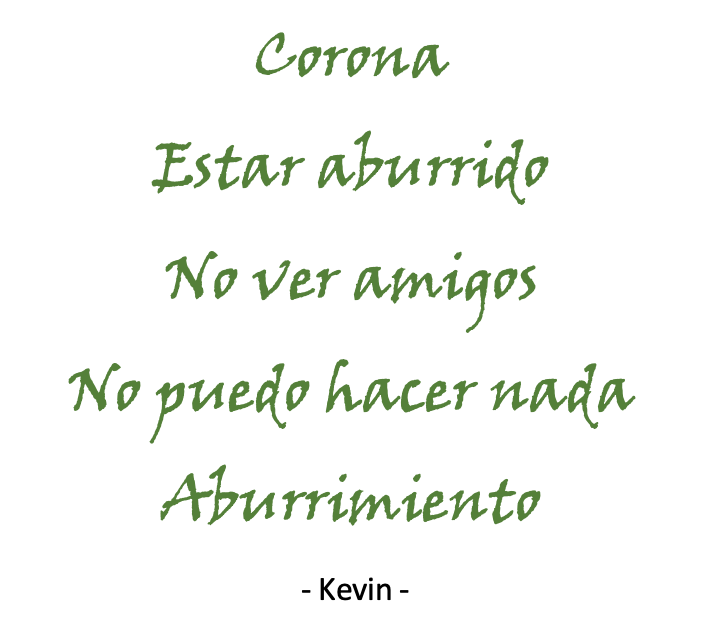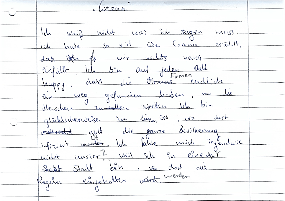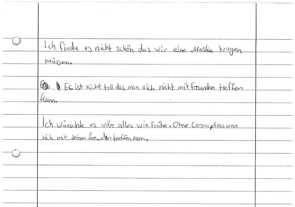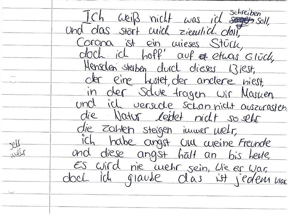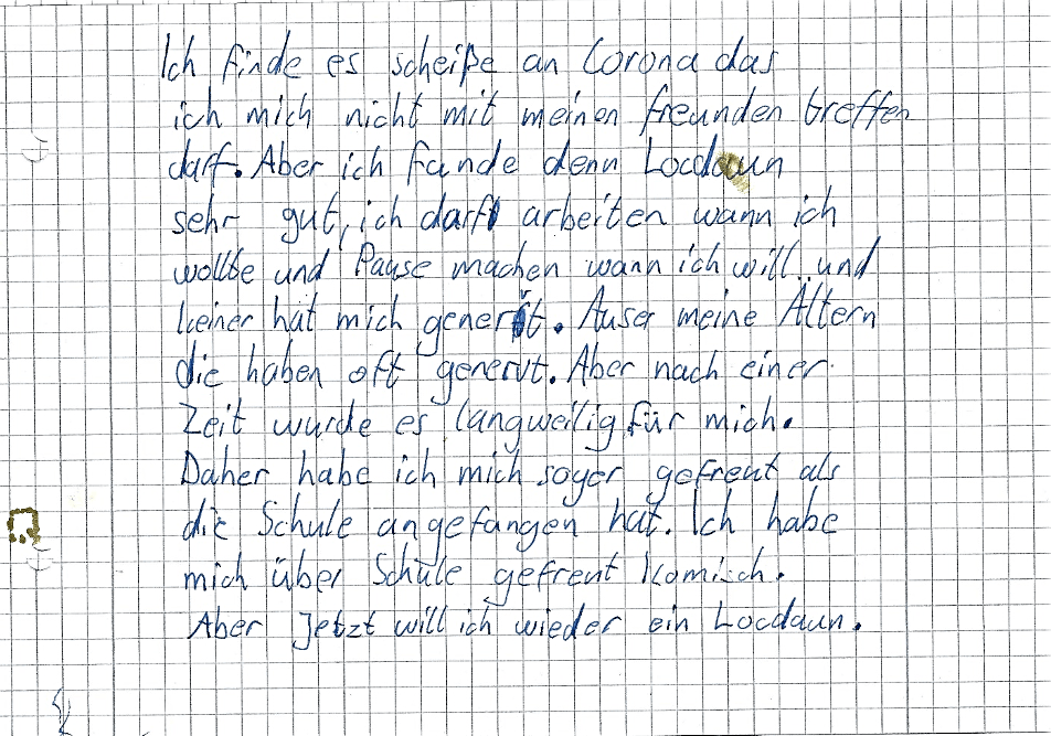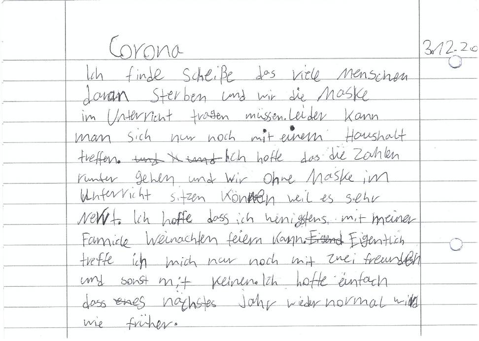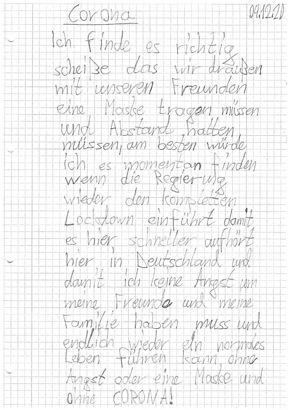 "Für mich bedeutet Corona vor allem Langeweile, keine Schule, keine Freunde, kein Sport und überalll nur ein Thema: Corona."