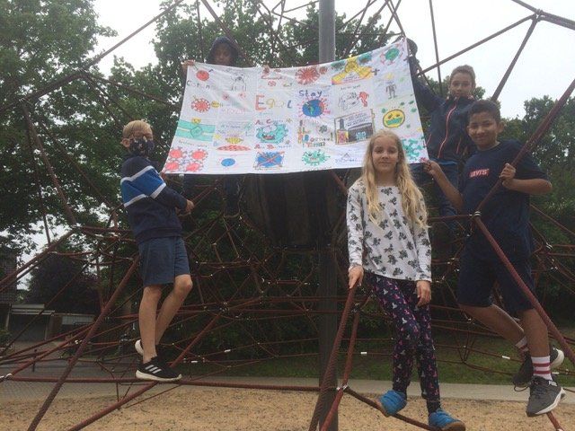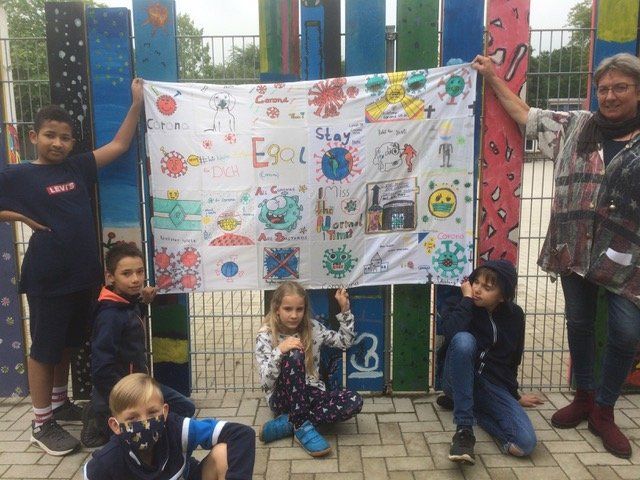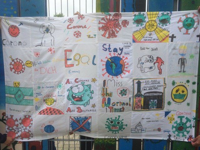 In der Schule werden „home schooling“ Aufgaben erledigt aber auch viele kleine Projekte sind möglich. Mehrere Kinder der Notbetreuung haben diese Corona Patchworkdecke gestaltet.