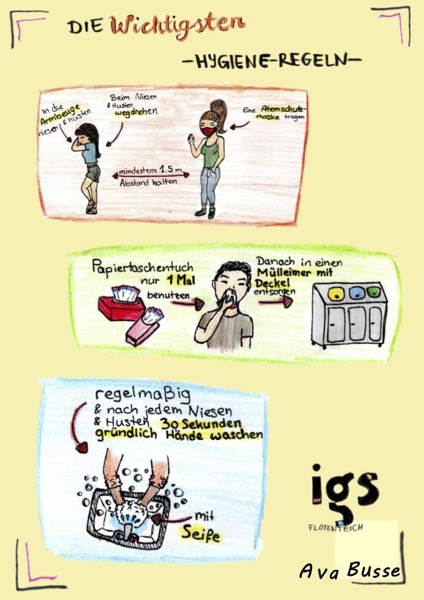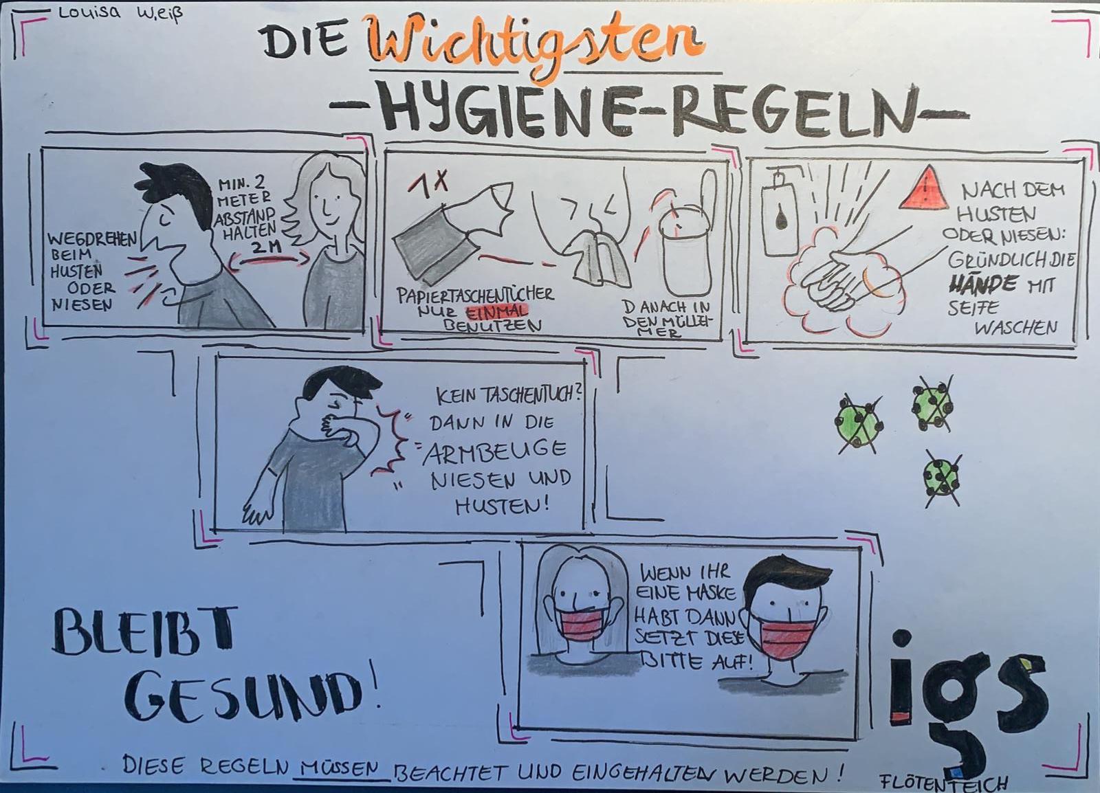 In der Coronakrise sind zu Zeiten des Schul-Wiederbeginns die Verhaltensregeln der IGS Flötenteich so. Augenfreundlich realisiert von Ava.