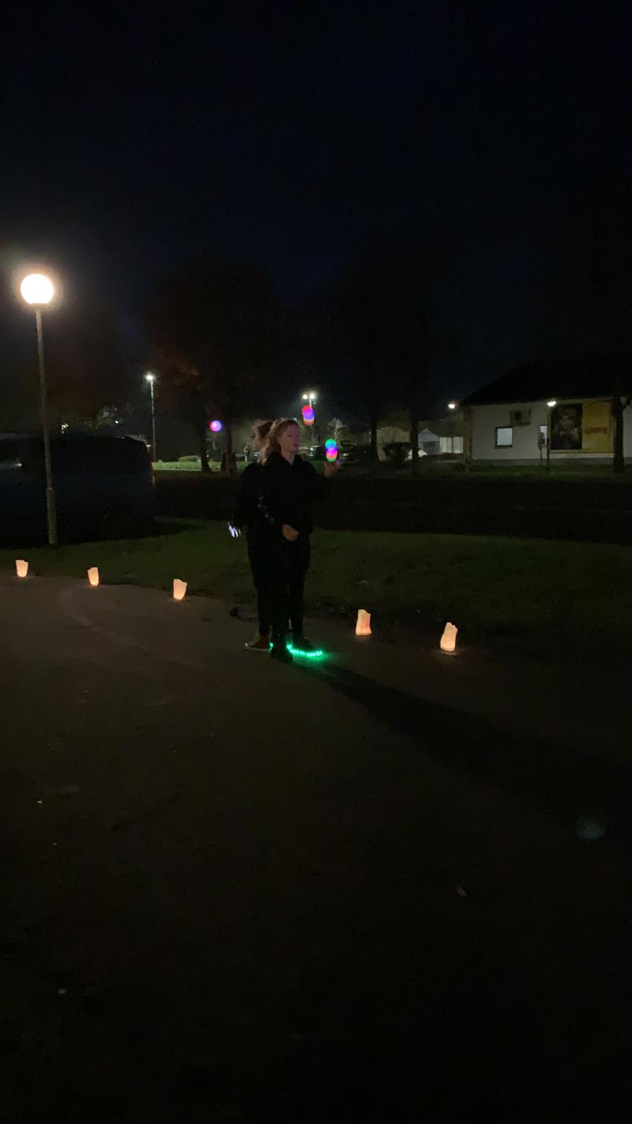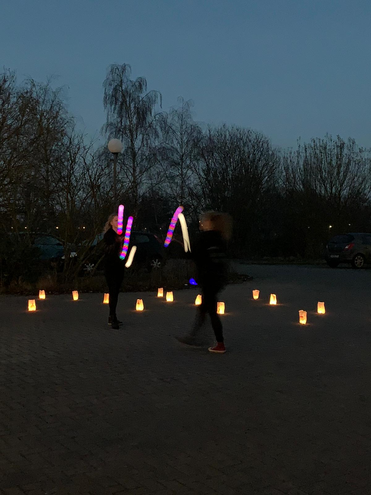 Lilly und Malou spielen Pois und Jonglage vor einem Seniorenwohnheim in Lemwerder